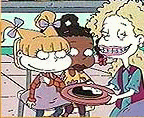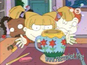 This special will serve as a lead-in for a Rugrats spinoff, "Preschool Daze", which will feature Angelica and Susie in pre-school. In this episode, Angelica and Susie go to their first day at preschool at the local community center. However, their first day ended up being a competition on who can be the best preschooler, as Angelica always tries to outshine Susie. But the big challenge comes when Angelica and Susie accidentally breaks Miss Weemer's favorite coffee cup; it's not just any coffee cup -- it reminded her of her old boyfriend, who has broken up with her awhile ago. Joining them on the mission to fix her broken cup is Harold, who becomes a pain in Angelica's side. Notes: 1. There were plans to show this episode in the fall of 2000, as a back-to-school special (which may or may not be related to the Back To School episode below), but those plans were shelved. 2. Also, this episode was also to have launched Rugrats' 2002 season on 1/21/2002, but that was also scrubbed. This episode was supposed to have aired before Hello Dilly (which takes place at the preschool), but in the US, Hello Dilly aired on Nick before Pre-School Daze, which remains to be seen in the US (not including US military personnel watching AFN, which did air this episode). Because of this, the continuity of this episode has been ruined, at least, for American viewers. As this episode was produced before Hello Dilly, and was the first episode in the 11th season list, Hello Dilly was seen after Pre-School Daze outside the US. (Top Left: Angelica steals a little girl's perfect drawing and claims it as her own. Bottom Left: Angelica, Susie & Harold try to replace Miss Weemer's mug. Both pictures from the France 3 telecast of Preschool Daze, from Super Yo; © 2001-2002 Viacom.) |