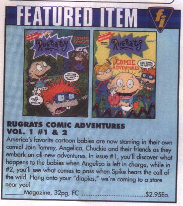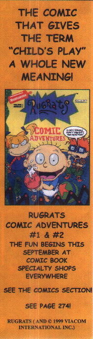 Most issues of Rugrats Comic Adventures are published without any advertising, so that kids can enjoy the Rugrats' adventures and activities without interruptions for sales pitches. Upper Right: Cover from first issue of Rugrats Comic Adventures. © 1997, 1999 Viacom. Lower Right: "Featured Item" listing from the July 1999 Previews; © 1999 Diamond Comics Distributors. Left: Ad from the July 1999 issue of Previews, featuring the cover of V.1 #1. © 1997, 1999 Viacom. |