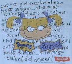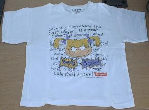 This girl's shirt has the Rugrats gang on top of the "Rugrats" logo. |