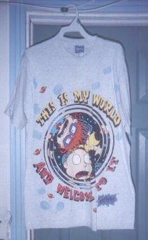 This boy's shirt has Tommy, Chuckie & Spike going around in a "whirlpool" fashion with the slogan around this: "This is my world and welcome to it." |