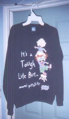 In this boy's sweatshirt, Tommy & Chuckie climb over each other on a stool, with this slogan: "It's a tough life but someone's gotta do it! |