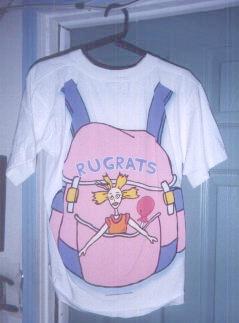 This girl's shirt has Angelica on front and her "Rugrats" backpack, with Cynthia, on the back. A similar shirt for boys has Chuckie on front and Reptar on back. |