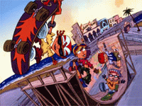 Rocket Power (Above; Nickelodeon titles it Nickelodeon Rocket Power for promotional purposes only; it was originally announced by Nick as Rocket Beach) -- Seen Mondays & Wednesdays at 8:30PM ET, it's a series about a group of friends set at Ocean Shores, a fictional, Santa Monica-esque community in southern California (according to Nick.Com, the venue is Rocket Beach), where the empasis is on extreme sports.