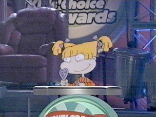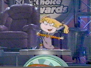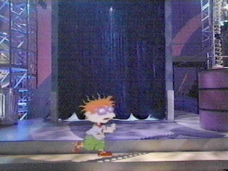 On 4/4/98, Rugrats took home its 3rd "Favorite Cartoon" award in a row in the 1998 Kids' Choice Awards. In addition to Rugrats, Hey Arnold is the other Nicktoon nominated, with the 2 other nominees from Fox: The Simpsons and King Of The Hill. As in the last 2 award shows, Rosie O'Donnell emcees. The presenters were Sabrina Enlos (?) from California (one of several winners of a contest where winners present the awards), Scott Wilson from Fox's Party Of Five and Miizi Chanel (?) from the Lost In Space movie, with the Lost In Space robot announcing the winner.Here's a transcript and pictures of Tommy, Chuckie & Angelica accepting the award; this time, they are animated right on stage (this is NOT the same technology used for Arnold in the Nogglevision specials). Prior to Robot's announcement, you can hear the crowd chant "Rugrats! Rugrats!" repeatedly: