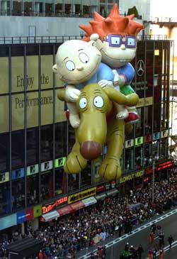 Apparently, Nick has felt that three balloons of Nick characters in the parade is enough, so when "Little Bill" became a balloon, they have to, shall I say, let the balloon go. With Jimmy Neutron and Blue's Clues still very hot properties, they decided to keep Rugrats out of the 2002 parade.