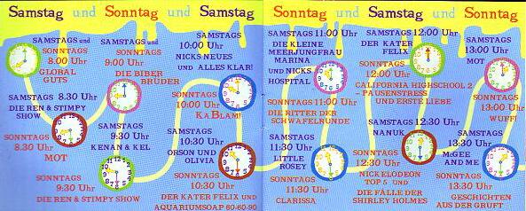 Above is the weekday schedule. Most shows are preceded with, or followed by, brief, home-cooked programming, such as Auf Draht, Joe Razz, Aquariumsoap and Nicks Neues.