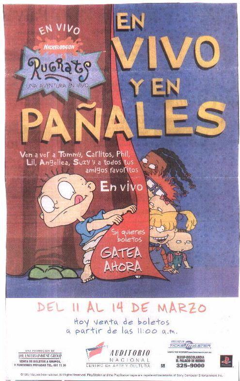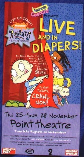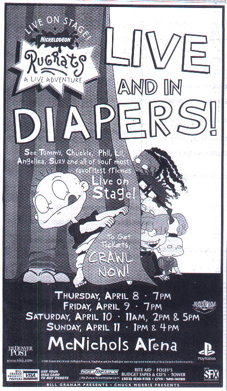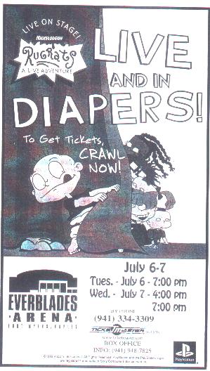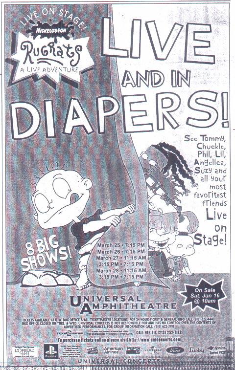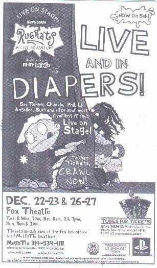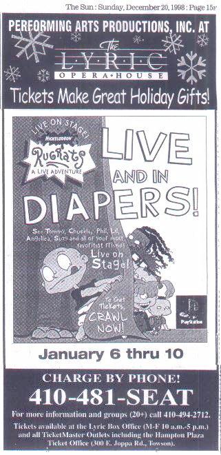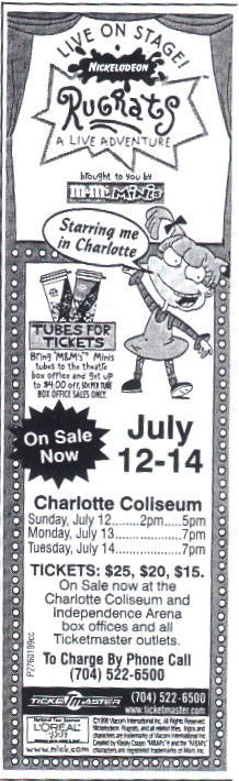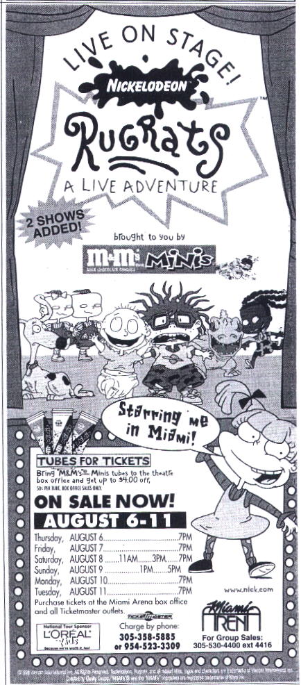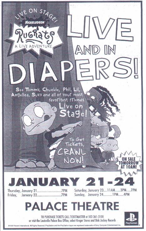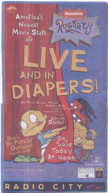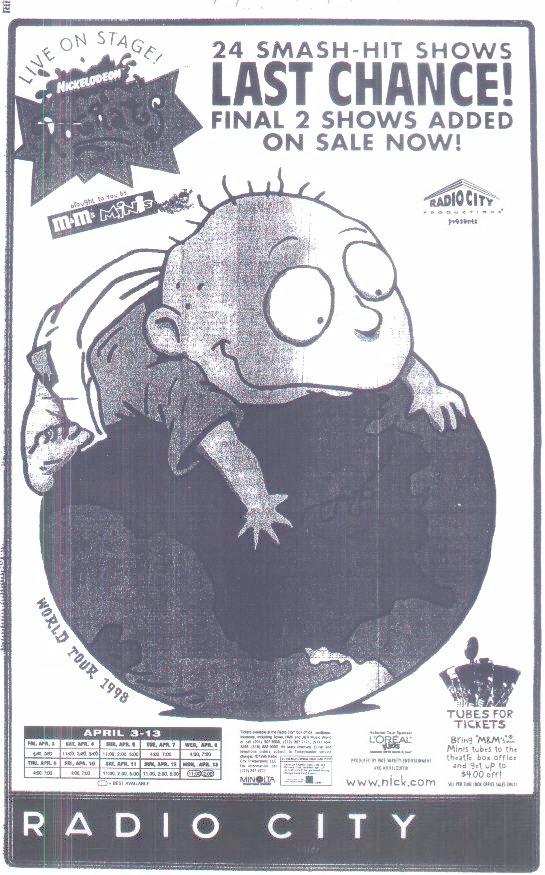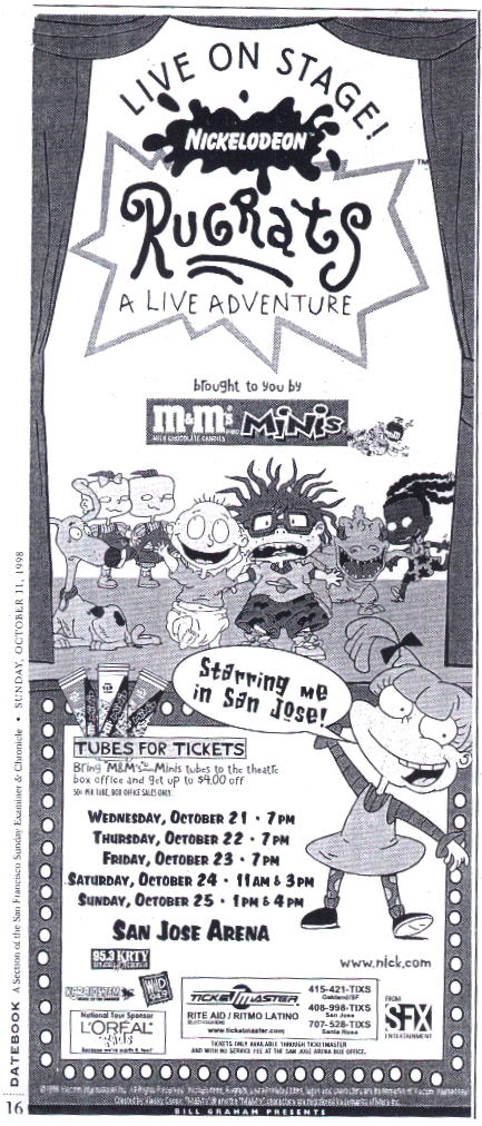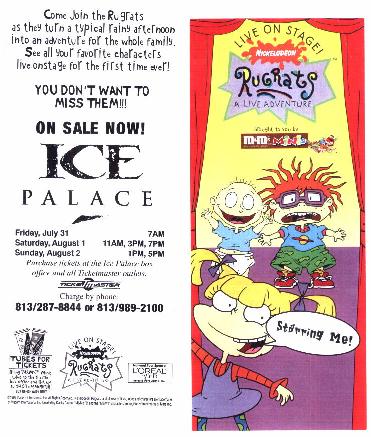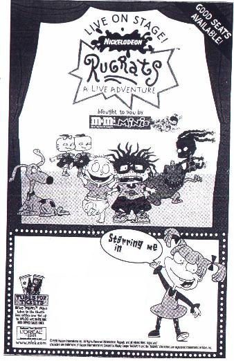 I -- All the Rugrats and Reptar appear on stage, with Chuckie looking scared and Angelica saying, "Starring me in (your city here)!" Those ads, more or less, are based on this basic design, given to the hosting venues for advertising. All they do is fill in the host city in Angelica's balloon and show and ticket information in the blank spaces at the bottom (often using "Rugrats" lettering) before submitting to the papers. (Generic design is actually the Chicago Tribune ad with the Chicago information whited out, so you can get the idea of the "generic" copy.)