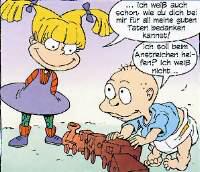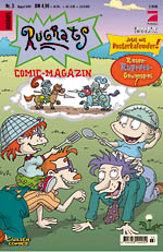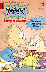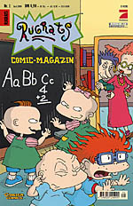 "Rugrats Comic-Magazin": The German VersionIn May 1999, Carlsen Verlag GmbH, a major publisher of comic books in Germany, began publishing the German version of the Rugrats comic book, Rugrats Comic-Magazin, in association with Klasky-Csupo and Pro Sieben (the German broadcaster that shows Rugrats). The cover price per issue is DM 4.90 in Germany (US$2.60), 36 Schillings in Austria (US$2.70), and 4.90 Swiss Francs (US$3.19). Carlsen publishes a wide range of German comics -- some of these from top German creators; some imports from outside Germany. The comics that Carlsen publishes cover a wide range of comic genres; they publish both DC & Marvel Comics, plus various independent, underground, children's & European comics, all for the German-speaking audience. For more information, visit their website. (Left & Right: The first 3 issues (May, June & July 1999) of Rugrats Comic-Magazin; from Carlsen Comics' website. ©1998-99 Carlsen Verlag GmbH & Viacom. Covers are based on the first 3 issues of the US version.) (Below: Sample panel from issue 4 of Rugrats Comic-Magazin; ©1999 Carlsen Verlag GmbH & Viacom.)