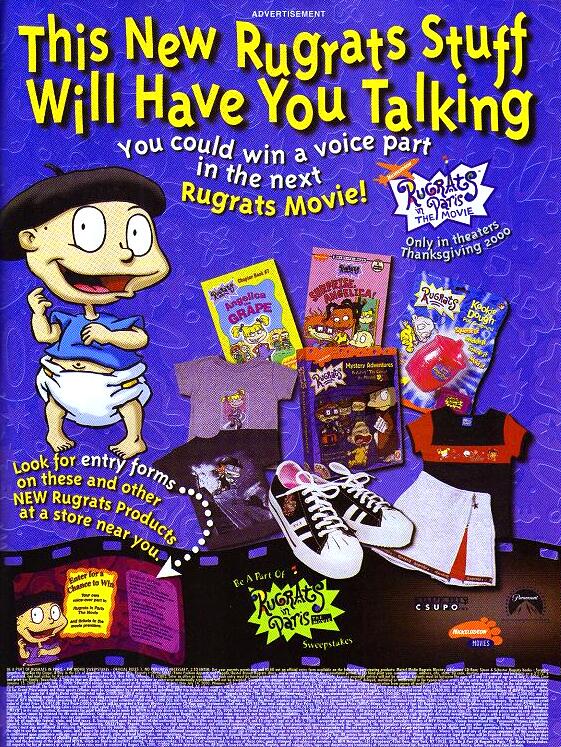 Winners Announced For Voice Role ContestOn 8/28/2000, the winners have been announced for a contest where 3 lucky winners, one each from the US, Britain and Australia, get to record a bit role for the movie. The British and Aussie winners, Ben Sunderland from England and Hannah Makragelidis from New South Wales, Australia, will record their roles in their home countries, while the US winner, Shannon Stephens, will go to Paramount Studios in Hollywood to record her role; she'll return in November to catch the world premiere of the movie. Likewise, Ben & Hannah will attend the national premieres in their own countries. Finally, all 3 winners will see their names in the closing credits. All winners will also receive an assortment of Rugrats merchandise and cash (Shannon will receive US$4000). The contest was presented in association with various licensees in the US (including Mattel and Simon & Schuster); and with the Woolworth's retail chain in Britain; Nick went at it alone in Australia. All 3 of them are credited as pre-schoolers in the film. Nick Latin America held a similar contest for the Spanish version of the film, due for release sometime in Spring 2001. Here, the winner will receive similar prizes, then fly with one other parent to a city to be specified, for recording. The only flaw, though, is that a Spanish version has already been completed, for Puerto Rico and Hispanic markets in the US. The role the winner will be doing will be in the version seen in the rest of Latin America and Spain, most likely insterted into the existing Spanish version. (Left: Ad for the contest, from an ad in the April 2000 issue of Nickelodeon Magazine; ©2000 Viacom. For a larger image, click here.) |