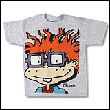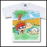 This girl's shirt has Angelica on front and her "Rugrats" backpack, with Cynthia, on the back. A similar shirt for boys has Chuckie on front and Reptar on back. |