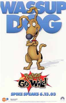 See The PostersIn April 2003, theatrical posters for the film became available to theaters showing the film. The first, teaser poster, shown here at left, features only Spike and the tag line "Wassup Dog?". The second poster, shown here at right, features the Rugrats at the top of the tree and the Thornberrys at the bottom. Both posters from the Club Cooltoons Newsletter; © 2003 Viacom. |